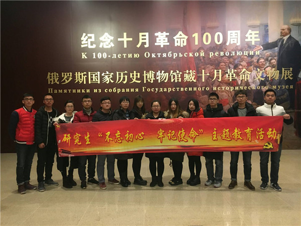 下午,实践团参观了“十月革命100周年”革命文物展,展览分为三个部分,分别是“伟大的革命”“人民的纪念”“中苏友谊”。通过参观十月革命时期的文物、表现革命瞬间的经典油画和雕塑、记录人民纪念革命、保卫革命政权的宣传画,以及反映中苏友好历史的200多件展品和十余张历史照片,同学们直观的感受到这场波澜壮阔的革命斗争、这次翻天覆地的历史巨变、一段中苏友好的真挚纪念。