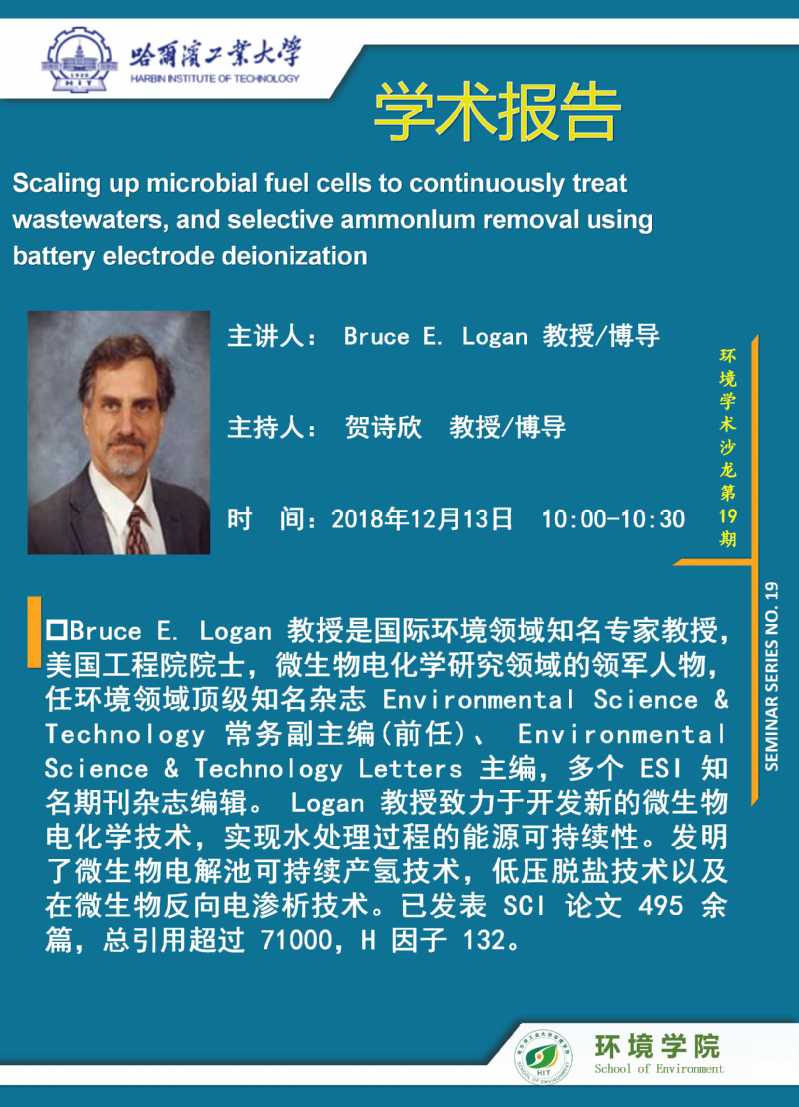 应贺诗欣教授的邀请,美国工程院院士Bruce E. Logan教授将于2018年12月13日访问在线成人 并进行学术交流,欢迎全校感兴趣的师生参加。学术讲座信息如下: