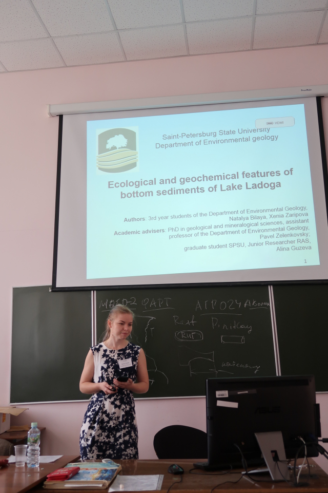 莫斯科时间6月6日上午10:00,大家准时来到了Institute of Earth science。首先是几位俄罗斯同学的报告,大部分俄方同学用的俄语做的报告,虽然听不懂俄语,但是八位环境科学系的同学通过翻译软件,不停地拍照、扫描、翻译,尽量使自己跟上他们的节奏。通过俄方同学的报告,不难发现,他们所做的研究方向和环境很接近,如Natalia做的便是湖底重金属的检测,而Anna做的是高程测量,则更偏向于地质生态。总体而言,俄方同学所做的科研方向主要是聚焦他们国家得地质生态方面的问题,这一点和中方学生可以说是不谋而合,中方同学的科研方向主要是关注中国生态环境方面的问题。