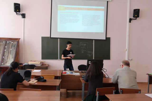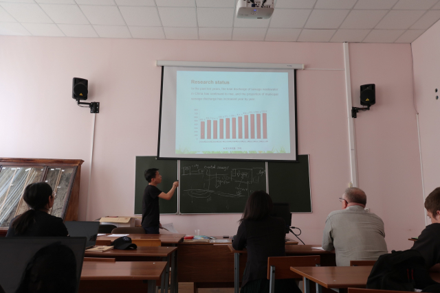 紧接着便是中方同学的报告。首先是王汝鹏同学,介绍了利用生物膜分离油和水;林炜国同学报告内容则是城市森林系统的构建;詹集旭同学介绍了非常热门时髦的话题——海绵城市;韩子希同学报告主题则是固定硝化菌群处理氨氮;杨超同学则介绍了微藻生物炭的利用;于航同学的主题是基于Hydrus3D的山东省漏斗区回灌模拟;潘奕霖同学的报告主题则是微流控型病毒检测分析装置研发;最后上场的陈佳序同学的报告主题则是污水处理厂二级出水长期回灌过程中重金属累计后环境健康风险评估。每位同学做完报告,俄方和中方同学都积极提问,提出自己的困惑和看法,比如俄方同学询问王汝鹏同学所用的生物膜是用什么材料制成;此外,俄方同学对于城市森林系统和海绵城市表现了极大的兴趣,双方进行了更进一步的交流沟通。