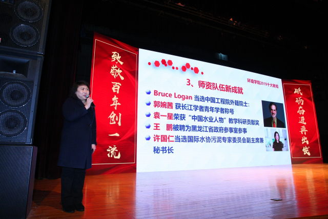 晚会在全年工作总结视频中开场。随后,常务副院长冯玉杰教授公布了马军当选中国工程院院士、任南琪荣获“全国模范教师”称号、学院2+1个团队入选黑龙江省“头雁”团队、三个专业入选国家级及省级一流本科专业、创办《环境科学与生态技术》期刊等在线成人 2019年十大新闻,并作了2020年重点工作汇报。会上,颁发了2019年度在线成人 145奖学金、建霖奖学金、刘光波奖学金、学术新星奖、国际合作突出奉献奖、国际合作团队奖、最佳留学生指导奖、最佳招生奉献奖、最高满意度奖、最佳保障服务奖等师生奖项,马军院士、祁佩时教授、刘光波先生作为嘉宾分别寄语在场师生员工。