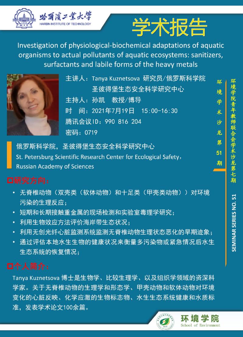 俄罗斯科学院,圣彼得堡生态安全科学研究中心Tanya Kuznetsova研究员将于2021年7月19日与在线成人 师生进行学术交流,欢迎感兴趣的师生参加线上学术报告会。