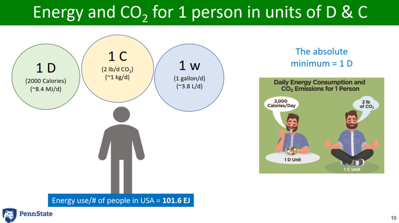 物质或能源摄取及消耗常以不同单位表示,使得能量归一量化具有极大的挑战和难度。Bruce E. Logan教授提出每日能量单位 D 和每日二氧化碳排放量单位 C 的概念,来简化对于能量的理解。比如每日摄入能量,两千卡约为8.4千焦/天可当量为1D;每日二氧化碳排放量2 lb/d约为1 kg/天可当量为1C,并据此计算个人每天能量摄取及消耗。