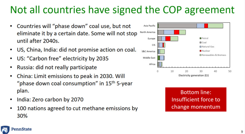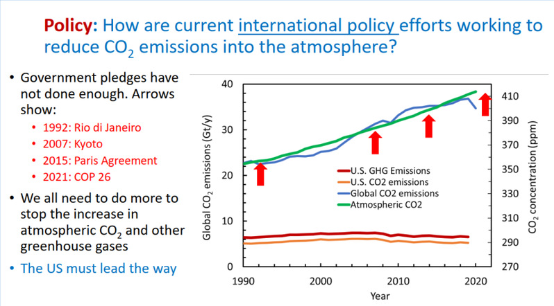 政策是一个经过深思熟虑后的指导方针体系,也是我们大学或者科研机构的作用所在——为合理改变提供指导。三十年来,全球为应对气候变化问题,陆续出台了许多政策,同时召开了多次联合国气候变化大会。例如1992年的里约峰会、2007年对《京都议定书》的讨论、2015年的《巴黎协定》、以及2021年举办的COP26。那么所做这些努力的作用效果如何呢?从二氧化碳的综合排放上看,1990-2021年大气中二氧化碳一直保持稳定上升趋势,一定程度上说明这些努力收效甚微,说明仅仅依靠政策制定对于碳减排及应对气候变化的成效显然是不够的。在COP26上,各国针对双碳制定了不同的政策,如美国表示将在2035年实现发电过程零碳排;中国承诺在2030年实现碳达峰;印度表示要在2070年实现零碳目标。然而,政策的制定并不是改变现有能源基础设施的强有力动力,在气候变化问题的改善上收效甚微。那么,面对这一全球性问题,未来的方向和发力点应该是什么?这个问题发人深省。