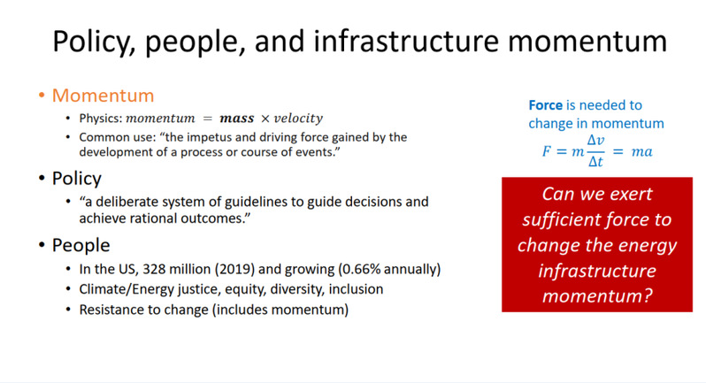 Bruce Logan教授指出应对气候变化、改变当前能源结构的动力,来源于个体的能耗关注与理解、而非仅仅依靠大尺度层面的合作。提出应对气候变化的要素为政策、人、基础设施能源结构转变的动力。那么如何理解这里的动力?Bruce Logan教授引入了物理学中动量的概念,提出这里所说的动力是由质量和速度决定的,可理解为以多快的速度以实现主体的变化。以此为前提,Bruce Logan教授分别阐述了不同动力:政策、人、基础设施能源结构改变在应对气候变化中的作用。