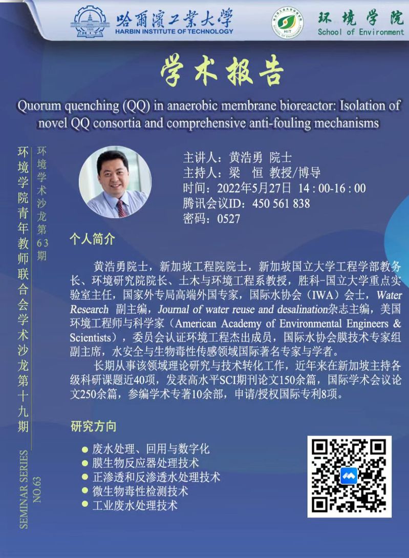 新加坡工程院院士、新加坡国立大学工程学部教务长、环境研究院院长、土木与环境工程系教授黄浩勇老师将于2022年5月27日与在线成人 师生进行学术交流,欢迎感兴趣的师生参加线上学术报告会。