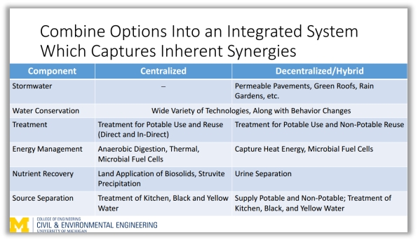 那么应该如何实现上述目标呢?我们需要将各策略组合集成到一个系统中,从而获得内在最优协同效果。Glen教授并对此进行了举例说明,在该系统中包含雨水收集系统、污水回收回用系统、热电系统、建筑内循环系统、雨洪管理系统、工业水供给系统、盐水处理系统等多个融合集成系统。