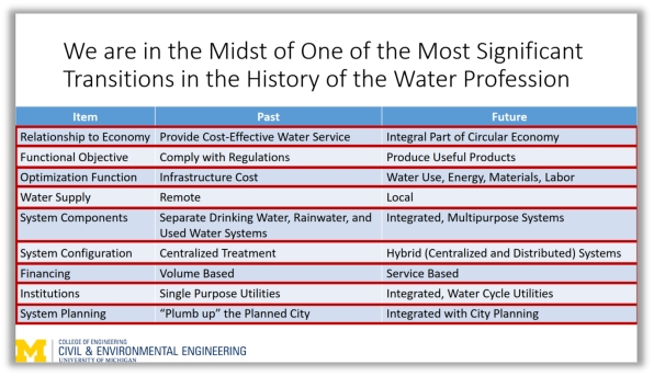 Glen教授详细列举了水行业正在面临的九大转折。污水管理与经济效益之间的关系,从追求经济有效的污水处理向融合循环经济变化;从功能主体满足行业标准向资源回收转变;从优化基础设施成本向污水利用、能量、材料以及劳动力等的综合优化变化;从远距离供水向就地取水变化;从单一系统向综合的多目标系统转变;从集中式的污水处理向多元的集中以及分散式污水处理系统转变;从基于数量的融资向基于服务的融资而转变;从单一目标体系向综合的多目标水循环目标体系变化;从改善已规划城市向融入城市规划而变化。