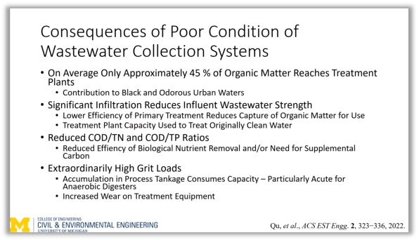 Glen教授指出,污水收集系统的基础设施现状应引起重视,由于污水收集系统的不足,可能引起污染物的外溢。中国也正在进行相关的改善,中国的污水具有独特的低C/N比特征,污水中含有大量的沙土等无机物质。现有的中国的污水处理中,有较大一部分有机质溢出系统而并未发挥其应有的作用。那么,较差的污水收集系统会导致哪些后果?Glen教授进一步做出了解答,大约仅45%的有机质到达污水处理系统;降低污水进水强度;进水C/N比以及C/P比被降低;沙砾负荷提高,占据工艺储蓄罐容量,增大设备磨损率。