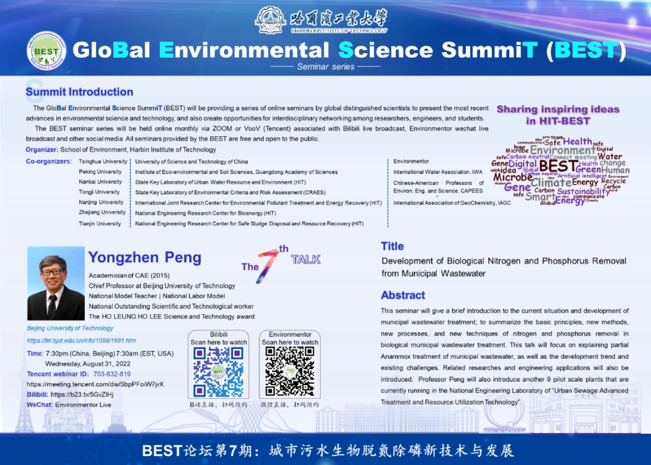 应BEST的邀请,BEST第七讲将由来自北京工业大学的彭永臻院士进行。