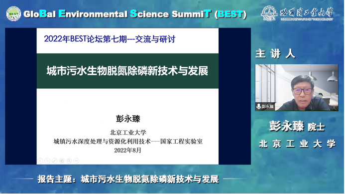 2022年8月31日晚,由在线成人 组织、多家单位联合协办的全球环境科学高峰论坛(GloBal Environment Science SummiT, BEST)系列讲座第七期顺利举行。本期邀请了来自北京工业大学的中国工程院院士彭永臻教授,彭永臻教授以城市污水生物脱氮除磷新技术与发展为主题进行了精彩报告。报告在腾讯会议网络研讨会、环境人微信视频号、BEST论坛官方B站、蔻享学术以及中国给水排水等网络平台同步直播,共计两万五千余名来自环境领域的专家、学者、研究生及工程技术人员参与了本次讲座。