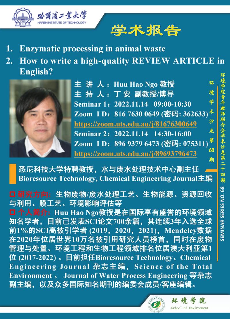 悉尼科技大学特聘教授,水与废水处理技术中心副主任,Bioresource Technology, Chemical Engineering Journal主编Huu Hao Ngo教授将于2022年11月14日与在线成人 师生进行学术交流,欢迎感兴趣的师生参加线上学术报告会。