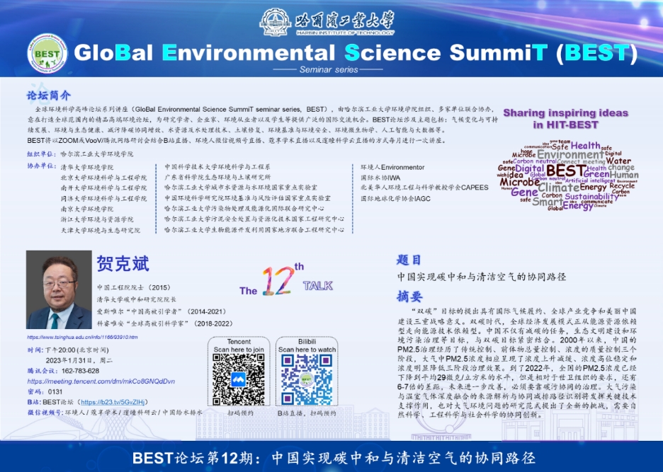 应BEST的邀请,BEST第十二讲将由中国工程院院士贺克斌教授进行。