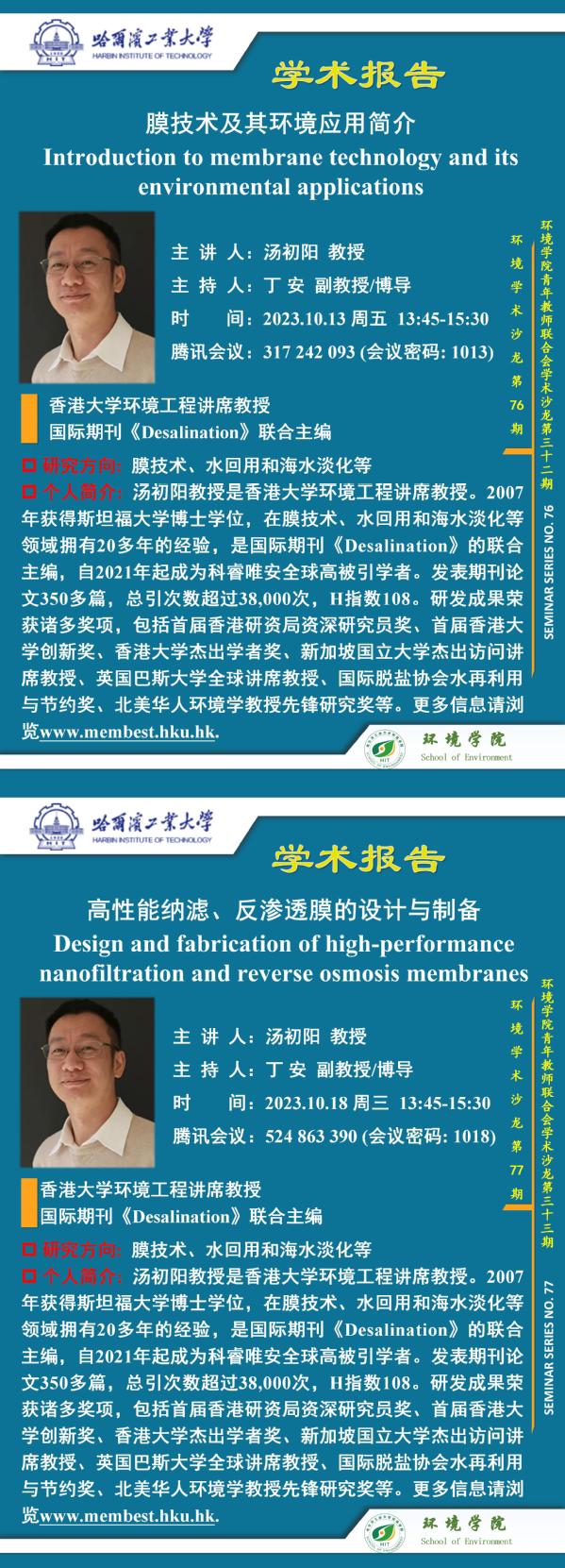 香港大学环境工程讲席教授汤初阳教授,将于202310月13日和10月18日在线成人 师生进行学术交流,欢迎感兴趣的师生参加线上学术报告会。