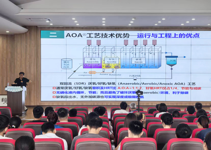 在讲座中,彭院士重点介绍了其团队历经40年潜心研究的AOA工艺技术。AOA工艺,即厌氧-好氧-缺氧工艺,是彭院士团队基于2012年率先发现后置内源反硝化现象基础上,于2015年在国内外首次开发的污泥双回流-AOA工艺技术。该技术通过将传统的A²O工艺中的缺氧段后置,形成厌氧-好氧-缺氧的独特生物处理流程,能够充分利用原水中的有机物,实现高效脱氮与节能降耗。