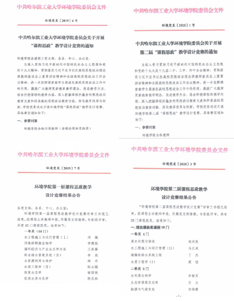 率先设计了课程思政教学设计竞赛。同时举办交流展示与研讨会,通过教艺切磋经验分享,快速有效实现了课程思政全覆盖,更新了蕴含课程思政内容的课程体系,完善了教学大纲、教学设计等指导性教学文件;2020年,哈工大“市政环境类专业课程思政教学团队”荣获黑龙江省首批教学团队;课程思政示范课、课程思政教学名师均榜上有名;校首届课程思政教学竞赛获特等奖1项,二等奖1项;青年教师全面发展,近四年入选国家人才计划8人,拔尖通道晋升9人,1人获全省青教赛一等奖第一名;学生在省级以上创新竞赛屡获大奖。2022年6月哈工大市在线成人 课程思体系构建及团队建设荣获黑龙江省教学成果一等奖。